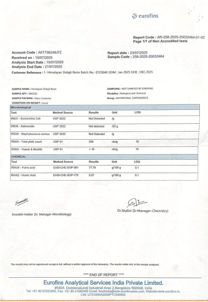 Aby byly účinky skutečně citelné, klíčovým faktorem je místo původu. Náš Shilajit je získáván na úpatí Himalájí, díky čemuž nabídne špičkovou kvalitu, 100% čistotu a maximální obsah účinných látek. Naopak neobsahuje žádné škodlivé chemické látky nebo těžké kovy.